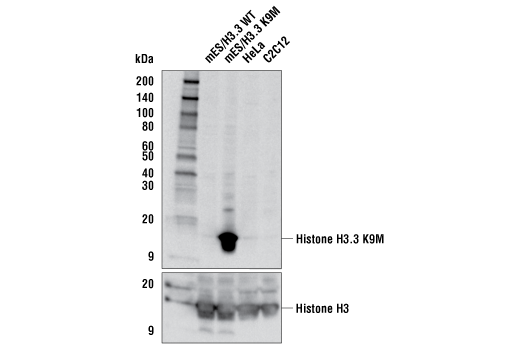 Histone H3 (K9M Mutant Specific) (E2E9L) Rabbit mAb recognizes endogenous levels of K9M mutant histone H3.1, H3.2, and H3.3 proteins. This antibody does not cross-react with wild-type histone H3.1, H3.2, or H3.3.