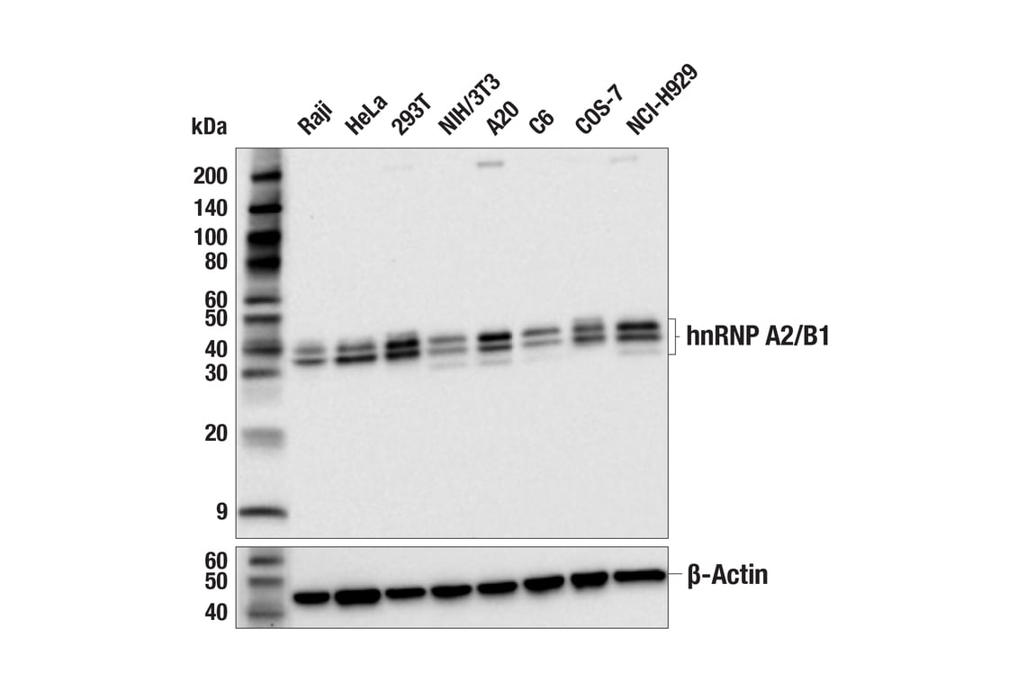 Heterogeneous nuclear ribonucleoprotein A2/B1 (hnRNP A2/B1) is a member of the hnRNP A/B family of related RNA-binding proteins that bind pre-mRNA and are involved in the processing, metabolism, and transport of nuclear pre-mRNA transcripts (1). Alternative splicing produces transcripts that encode two homologous hnRNP proteins, hnRNPA2 and hnRNPB1, from a single gene sequence (2). Studies demonstrate hnRNP A2/B1 splicing repression across multiple targets (3,4) and that both proteins can bind and protect telomere repeat sequences from DNase digestion (5,6). Altered expression of hnRNP B1 is seen in several forms of cancer, including squamous cell carcinoma, adenocarcinoma, and various forms of lung cancer (7). Overexpression of hnRNP B1 may be associated with inhibition of DNA-PK activity and impaired DNA repair during early stages of cancer development (8). Autoantigens to hnRNP A2/B1 (termed RA33) are associated with rheumatoid arthritis, systemic lupus erythematosus, and mixed connective tissue disease (9-11).