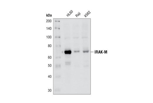 Unlike IRAK1 and IRAK4, IRAK2 and IRAK-M do not have significant kinase activity although they can still activate NF-κB when overexpressed (4). Expression of IRAK-M is more restricted compared to other family members with highest levels of expression occurring in monocytes/macrophages (4). Studies from IRAK-M knockout mice suggest that IRAK-M may play a role as a negative regulator of Toll-like receptor signaling and innate immune responses by preventing the dissociation of IRAK1 and IRAK4 from MyD88 and the subsequent formation of its complex with TRAF6 (5).