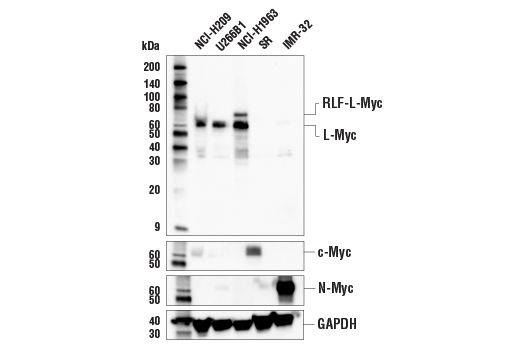 The Myc family is comprised of c-Myc, N-Myc, and L-Myc with often distinct patterns of expression during development as well as cancer (5). Amplification of each of the family members in cancer is frequently mutually exclusive with c-Myc being the most widely studied and most commonly amplified. N-Myc amplification, on the other hand, is found predominantly in neuroblastomas, and L-Myc amplification has been described in small cell lung cancer (SCLC) (6). Amplification of L-Myc in SCLC may result from chromosomal rearrangement between the rlf and MYCL genes (7). L-Myc expression by dendritic cells may be required for optimal T cell priming (8).