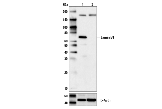 Lamin B1 (D9V6H) Rabbit Monoclonal Antibody recognizes endogenous levels of total lamin B1 protein. This antibody recognizes the 45 kDa lamin B1 carboxy terminal cleavage product produced during apoptosis.