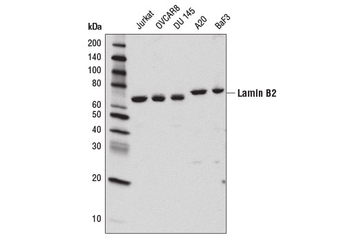 Lamin B2 (E1S1Q) Rabbit mAb recognizes endogenous levels of total lamin B2 protein.