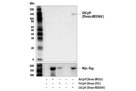 LbCpf1/Cas12a (Strain ND2006) (E8B1W) Rabbit Monoclonal Antibody recognizes transfected levels of total LbCpf1/Cas12a (Strain ND2006) protein. This antibody does not cross-react with Cas9 (S. pyogenes), Cas9 (S. aureus), AsCpf1/Cas12a (Strain BV3L6), or FnCpf1/Cas12a (Strain U112) protein.