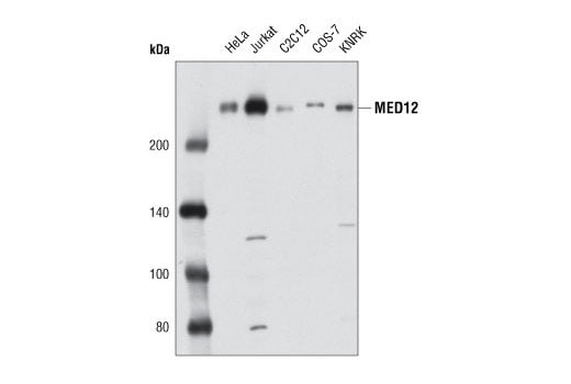 MED12 is part of the CDK8 submodule of the Mediator complex and is required for the stable interaction of this module with the rest of the Mediator complex (1,9). The CDK8 module has been shown to be both a negative and positive regulator of transcription depending on the gene context. The CDK8 module may repress transcription by inhibiting the ability of Mediator to recruit RNAPII (10). In addition, the MED12 subunit can recruit the methyltransferase G9a to methylate histone H3K9 to repress a subset of neuronal genes in non-neuronal cells (11). MED12 and the CDK8 module can also positively regulate transcription of Wnt-responsive genes through its interaction with β-catenin, and p53-regulated genes upon UV-induced DNA damage (1,9,12).