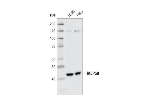 MEP50 is a WD repeat protein that may provide an interface for multiple protein interactions between methylosome proteins. (1). It binds to JBP1, an arginine protein methyltransferase component of the methylosome. MEP50 has been shown to interact with CTD phosphatase FCP1 (CTDP1), a protein that may link the processes of transcriptional elongation and splicing (2), and with SUZ12, a polycomb group protein involved in transcriptional repression (3). JBP1 and MEP50 have also been reported to interact with the methyl-CpG binding protein complex MBD2/NuRD (4).