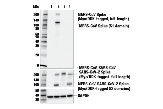 MERS-CoV Spike Protein (E9P2L) Mouse Monoclonal Antibody recognizes transfected levels of total MERS-CoV spike protein. This antibody detects full-length MERS-CoV spike protein and also detects the S1 fragment generated by host protease cleavage. This antibody does not cross-react with spike proteins from SARS coronaviruses (CoV-1, CoV-2).