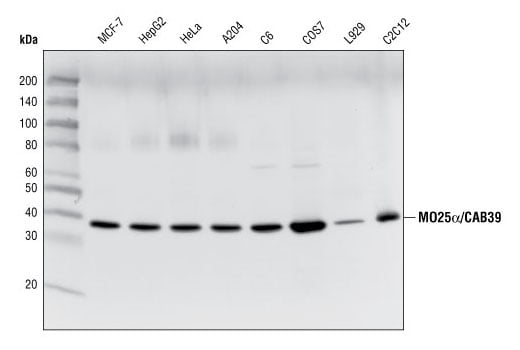 MO25 alpha/CAB39 (C49D8) Rabbit Monoclonal Antibody detects endogenous levels of total MO25α/CAB39 and MO25β/CAB39L proteins.