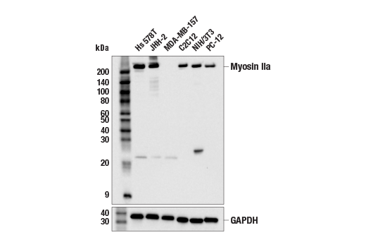 Myosin IIa (E7Y9O) Rabbit Monoclonal Antibody recognizes endogenous levels of total myosin IIa protein. This antibody does not cross-react with myosin IIb or myosin IIc protein. This antibody cross-reacts with 20-25 kDa bands of unknown origin by western blot.