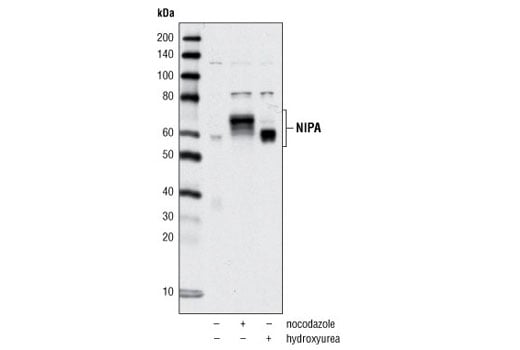 Expression levels of NIPA are low in G0/G1 phases and upregulated in S and G2/M phases. The SCFNIPA complex targets nuclear cyclin B1 for ubiquitination in interphase, whereas phosphorylation of NIPA in late G2 phase and mitosis inactivates the complex to allow for accumulation of cyclin B1 (3). NIPA may have an anti-apoptotic role in NPM-ALK-mediated signaling events (4).
