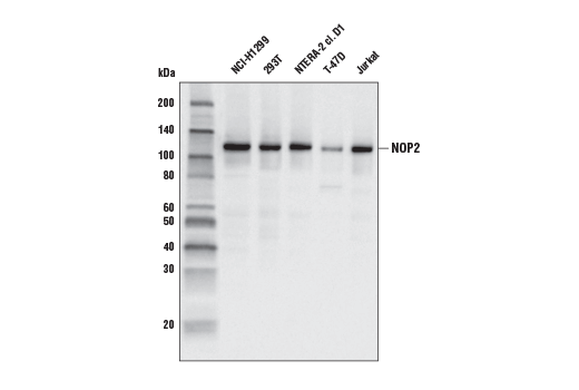 NOP2, also known as NSUN1, is an 89 kDa member of the NSUN protein family that specifically targets and methylates 28S rRNA (3). In humans, methylation of C4413 in the 28S rRNA by NOP2 is thought to increase stability of the ribosome. NOP2 is strongly overexpressed in many cancers, including colorectal and lung cancer, where it may contribute to tumorigenesis by recruiting telomerase to the cyclin D1 promoter and activating gene expression (4-6). NOP2 also interacts with BRD4 and RNA polymerase II, suggesting additional roles for NOP2 in regulating transcription (1,7).
