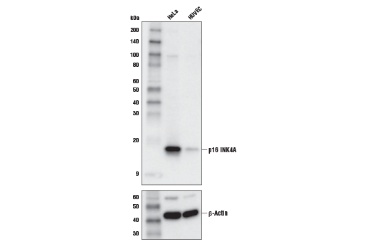 p16 INK4A expression, typically repressed in the absence of stress, is thought to drive cells into senescence, and p16 INK4A expression is a commonly used marker of senescent cells (2,3). p16 INK4A protein expression is often altered in human cancer, and high expression is currently used as a predictive biomarker in cervical cancer (3-5).