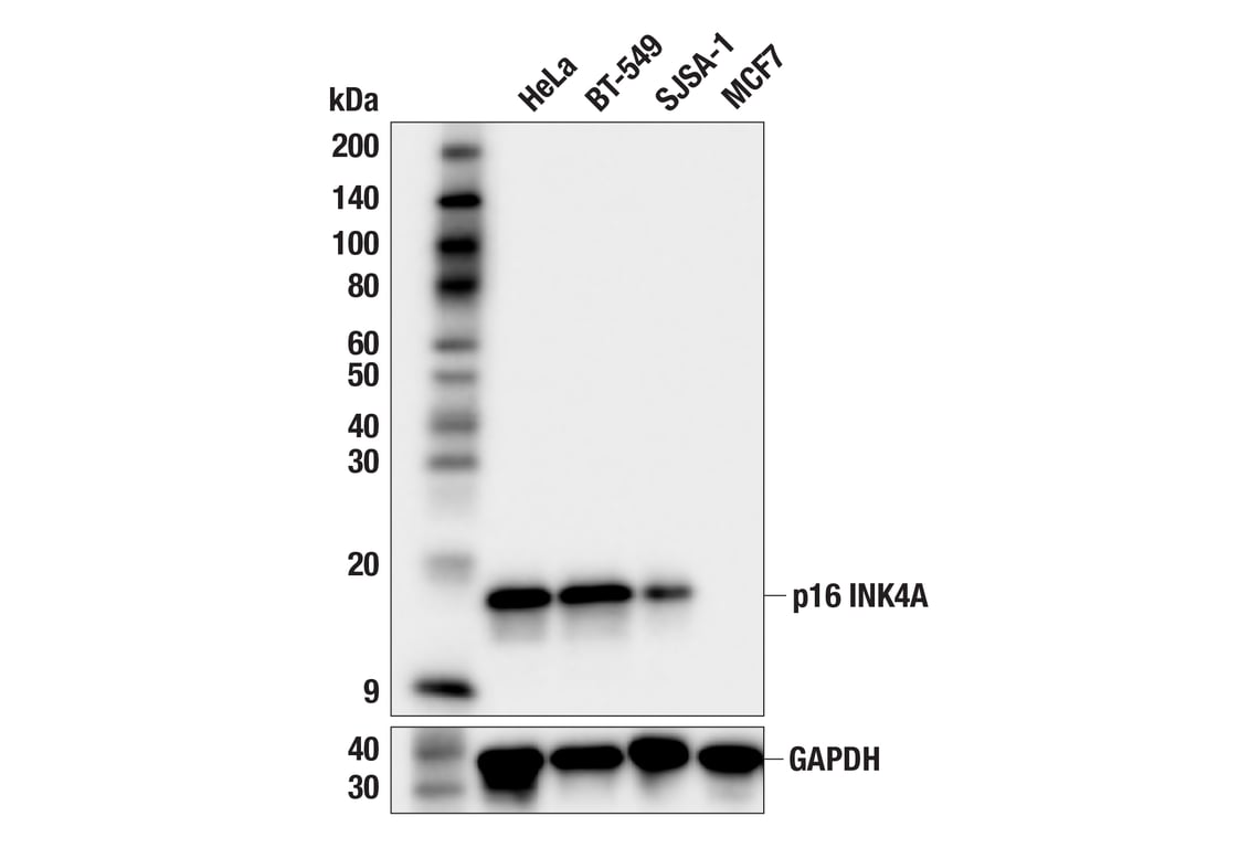 p16 INK4A expression, typically repressed in the absence of stress, is thought to drive cells into senescence, and p16 INK4A expression is a commonly used marker of senescent cells (2,3). p16 INK4A protein expression is often altered in human cancer, and high expression is currently used as a predictive biomarker in cervical cancer (3-5).