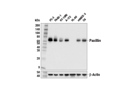 Paxillin (E6R6Z) Rabbit Monoclonal Antibody recognizes endogenous levels of total paxillin protein. This antibody also recognizes α, β, and γ paxillin isoforms.