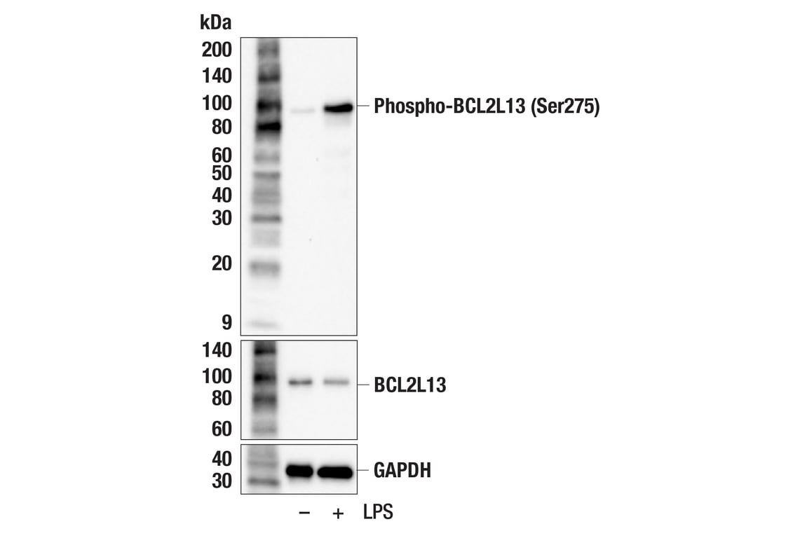 Phospho-BCL2L13 (Ser275) Antibody recognizes endogenous levels of BCL2L13 protein only when phosphorylated at Ser275 of human BCL2L13 (equivalent to Ser272 of mouse BCL2L13).