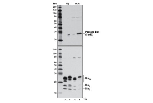 Phospho-Bim (Ser77) (D4H12) Rabbit mAb recognizes endogenous levels of Bim protein only when phosphorylated at Ser77.