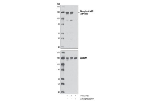 Phospho-CARD11 (Ser652) Antibody detects endogenous levels of CARD11 protein only when phosphorylated at Ser652.