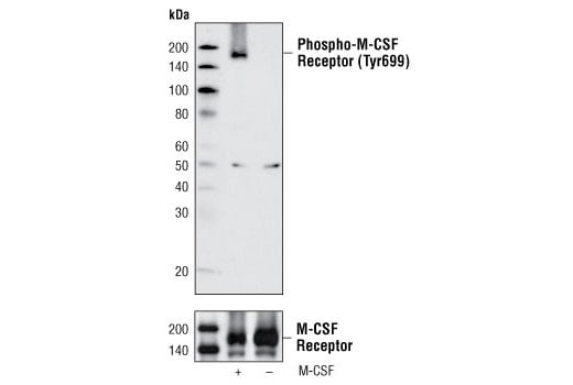 Phosphorylation of M-CSF receptor on Tyr669 was identified at Cell Signaling Technology (CST) using PhosphoScan®, a CST® LC-MS/MS platform for phosphorylation site discovery, as well as in another publication (10). Autophosphorylation at Tyr699 in the kinase insert (KI) domain appears to provide a binding site for the Grb2 adaptor protein (9).