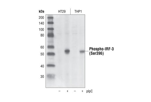 Phospho-IRF-3 (Ser396) (4D4G) Rabbit Monoclonal Antibody detects endogenous levels of IRF-3 when phosphorylated at Ser396.