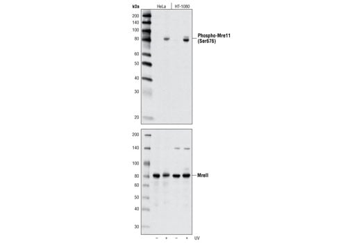 Phospho-Mre11 (Ser676) Antibody is directed to a site that was identified at Cell Signaling Technology (CST) using PhosphoScan®, CST's LC-MS/MS platform for modification site discovery. Phosphorylation at Ser676 was discovered using an ATM/ATR substrate antibody and was shown to be induced by UV treatment (7). Please visit PhosphoSitePlus®, CST's modification site knowledgebase, at www.phosphosite.org for more information.