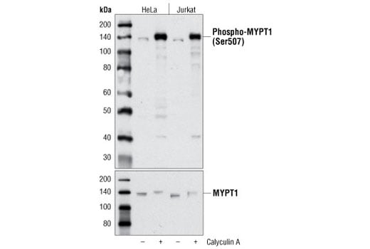 Phospho-MYPT1 (Ser507) Antibody is directed at a site that was identified at Cell Signaling Technology (CST) using PhosphoScan®, CST's LC-MS/MS platform for modification site discovery. Phosphorylation at Ser507 was discovered using an Akt substrate antibody. Please visit PhosphoSitePlus®, CST's modification site knowledgebase, at www.phosphosite.org for more information.