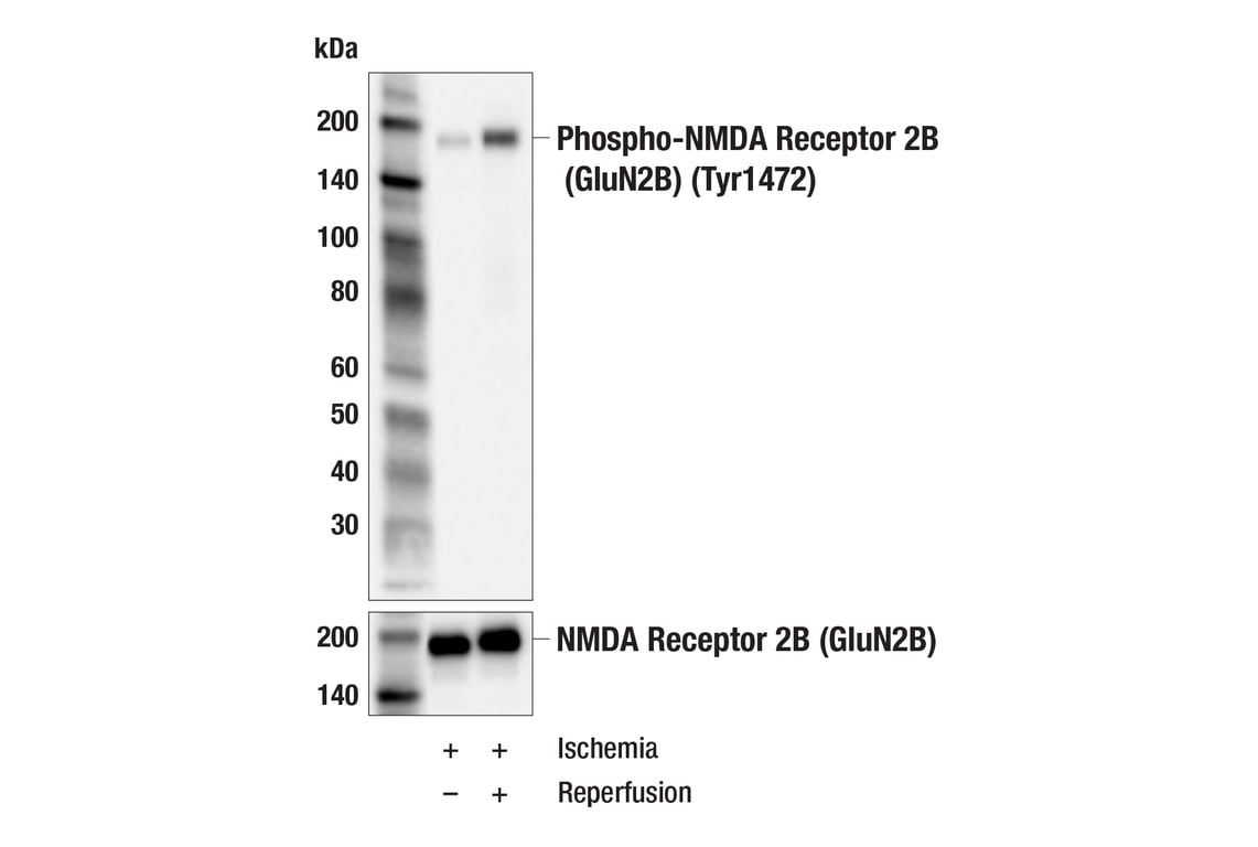 EphrinB2 binding to the receptor EphB leads to the activation of Src family tyrosine kinases, which phosphorylate NMDAR2B at Tyr1252, Tyr1336, and Tyr1472. In turn, phosphorylated NMDAR2B enhances the ability of the functional NMDA receptor to regulate Ca2+ influx in response to glutamate (7,8). Phosphorylation of NMDAR2B at Tyr1472 was independently identified at Cell Signaling Technology (CST) using PhosphoScan®, CST's MS/MS platform for phosphorylation site discovery. Phosphorylation of NMDAR2B at Tyr1472 was observed in extracts isolated from ischemic rat brain. For additional information, please visit PhosphoSitePlus®, CST's modification site knowledgebase, at www.phosphosite.org.