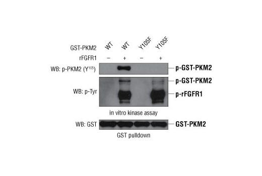 Phosphorylation of PKM2 on Tyr105 was identified at Cell Signaling Technology (CST) using PhosphoScan®, CST's LC-MS/MS platform for phosphorylation site discovery.