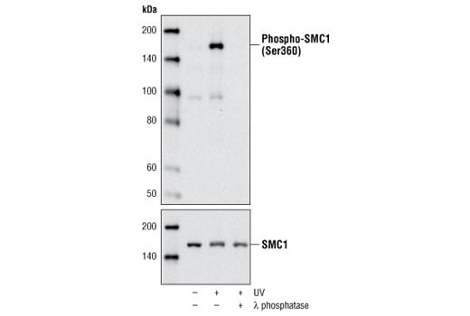 The serine residue at 360 of SMC1 is phosphorylated in an ATM/ATR-dependent manner in response to DNA damage (5,6). Phospho-SMC1 (Ser360) Antibody is directed at a site that was identified at Cell Signaling Technology (CST) using PhosphoScan®, CST's LC-MS/MS platform for modification site discovery. Phosphorylation at Ser360 was discovered using an ATM/ATR substrate antibody and was shown to be induced by UV treatment. Please visit PhosphoSitePlus®, CST's modification site knowledgebase, at www.phosphosite.org for more information.