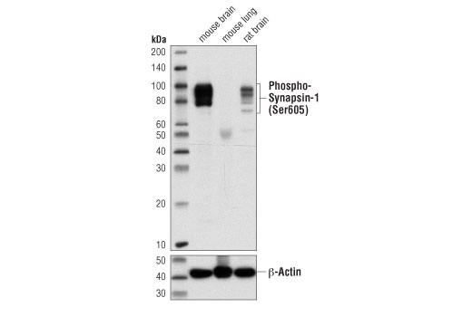 Phospho-Synapsin-1 (Ser605) (D4B9I) Rabbit mAb recognizes endogenous levels of Synapsin-1 protein only when phosphorylated at Ser605 (corresponds to Ser603 in rat).