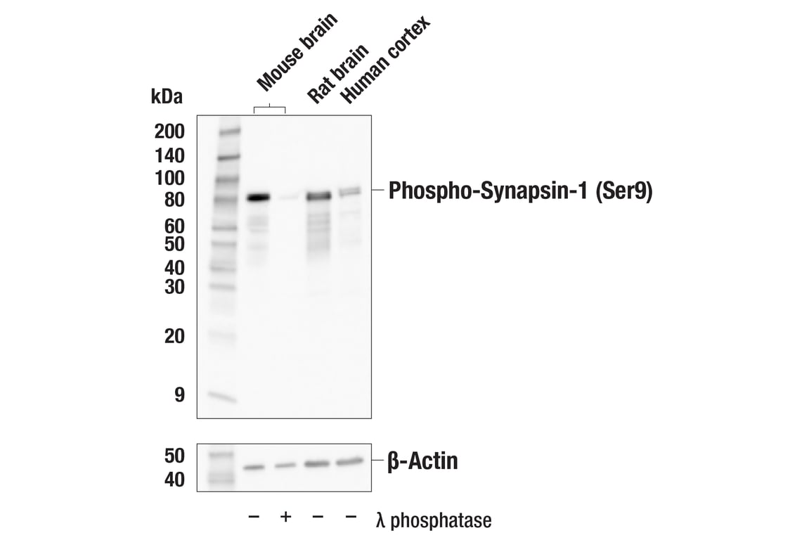 Phospho-Synapsin-1 (Ser9) (E3D2X) Rabbit Monoclonal Antibody recognizes endogenous levels of synapsin-1 protein only when phosphorylated at Ser9.