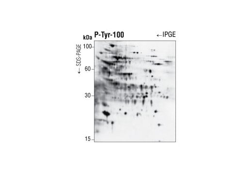 Phospho-Tyrosine Mouse Monoclonal Antibody (P-Tyr-100) is a high affinity antibody. ELISAs against a wide variety of phosphopeptides indicate that P-Tyr-100 binds phospho-Tyr in a manner largely independent of the surrounding amino acid sequence. 2D gel Western blot analysis of pervanadate-treated cell extracts also shows that P-Tyr-100 interacts with a broad range of tyrosine-phosphorylated proteins. P-Tyr-100 does not cross-react with peptides containing phospho-Ser or phospho-Thr.
