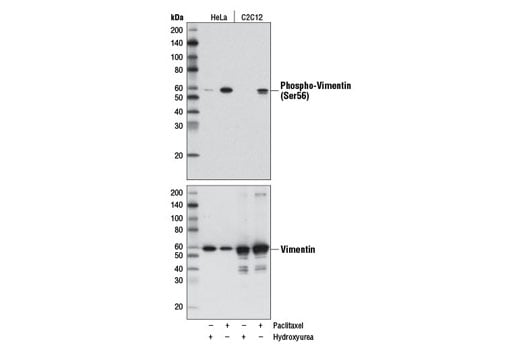 Phospho-Vimentin (Ser56) (D5H2) Rabbit mAb (BSA and Azide Free) recognizes endogenous levels of vimentin protein only when phosphorylated at Ser56.