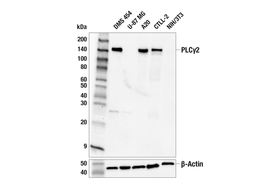 PLCγ2 (F9L8Z) Rabbit mAb recognizes endogenous levels of total PLCγ2 protein. This antibody lacks sensitivity by immunofluorescence in human samples. This antibody has nonspecific nuclear background in cultured mouse and human cells. Nonspecific puncta are detected by immunofluorescence in fixed frozen mouse brain.