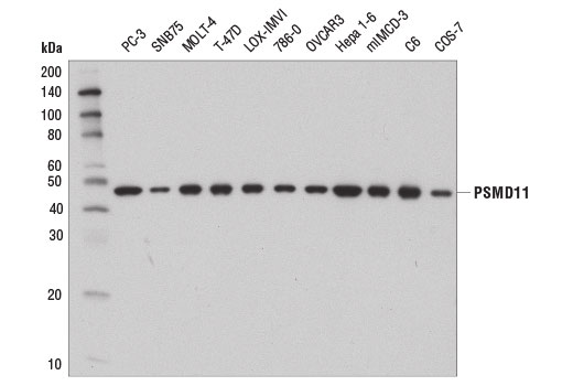Proteasome 26S subunit, non-ATPase, 11 (PSMD11, RPN6) is a non-ATPase subunit of the 19S/PA700 RP lid subcomplex. Research studies have shown that PSMD11 expression is regulated by FOXO4 in human embryonic stem cells (hESCs). Increased PSMD11 expression in hESCs correlates with high levels of proteasome activity, which may be required for protection from proteotoxic stress and senescence (3).