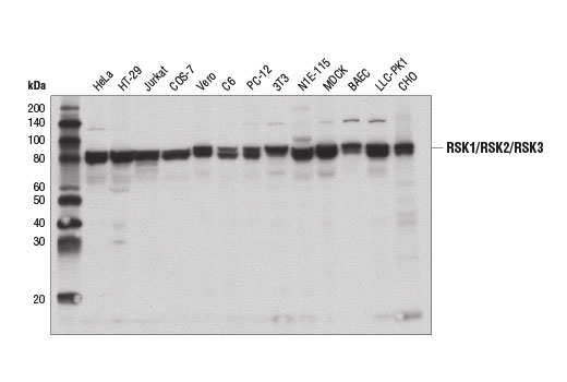 RSK1/RSK2/RSK3 (D7A2H) Rabbit Monoclonal Antibody recognizes endogenous levels of total RSK1, RSK2, and RSK3 proteins. This antibody is predicted to cross-react with RSK4 but has approximately 100-fold greater affinity for RSK1, RSK2, and RSK3. This antibody does not cross-react with other homologous RSK family members, such as human or mouse MSK1 or MSK2.
