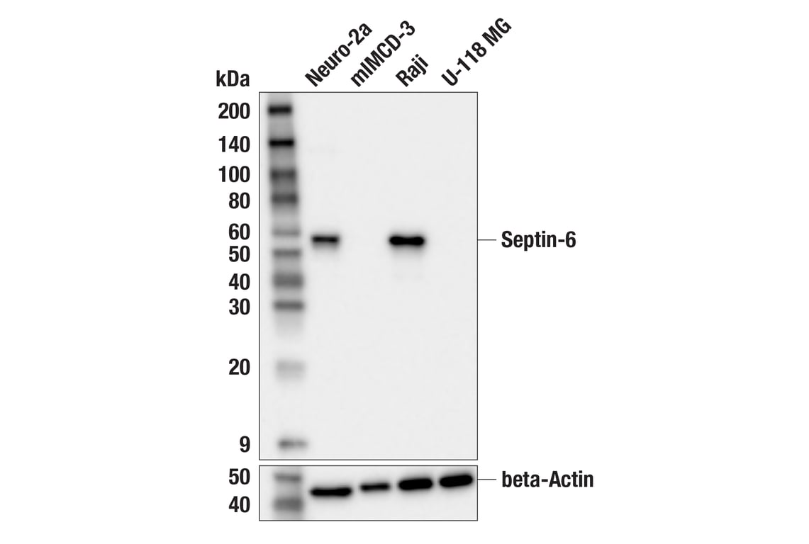 Septin-6 (F2Y9V) Rabbit Monoclonal Antibody recognizes endogenous levels of total septin-6 protein.
