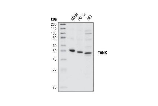 TRAF-associated NF-κB activator (TANK), also known as TRAF-interacting protein (I-TRAF), is a TRAF binding protein that demonstrates both stimulatory and inhibitory properties (5,6). TANK binds to the carboxy domain of the TRAF1, -2 and -3. Overexpression of TANK prevents the association of TRAF2 with TNFR2, inhibiting TNFR2 and CD40 induced NF-κB activation (6). TANK is also reported to synergize with low levels of TRAF2 to activate NF-κB (5). TANK assists in the activation of NF-κB via association and activation of TANK-binding kinase 1 (TBK1) or IKKε which promotes activation of the IKK complex (7,8). It has also been shown that TANK may synergize with TRAF2, TRAF5, and TRAF6 but not TRAF3 in SAPK activation (9). TNFα stimulation results in IKKβ-dependent phosphorylation of TANK which may provide negative feedback regulation of TANK mediated NF-κB activation (10).