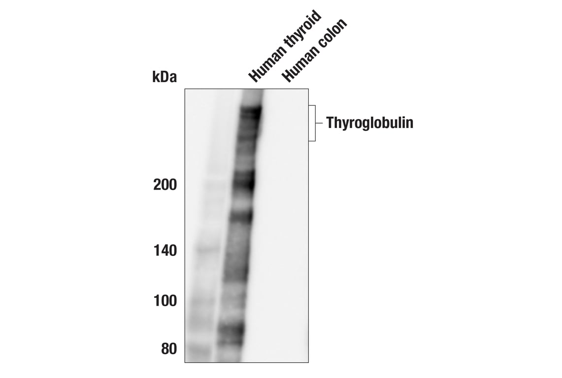 Thyroglobulin (F5O9B) Rabbit Monoclonal Antibody recognizes endogenous levels of total thyroglobulin protein. Non-specific staining was observed in kidney by immunohistochemistry.