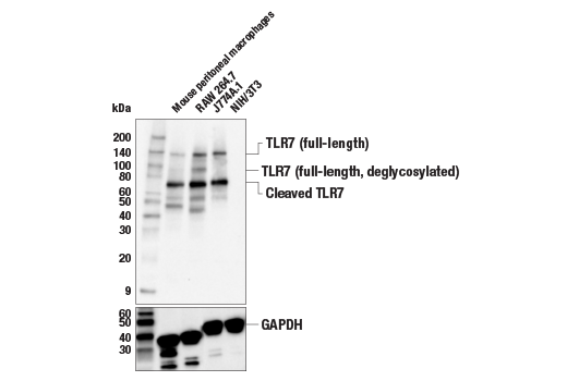 Toll-like Receptor 7 (E4J3Z) Rabbit Monoclonal Antibody recognizes endogenous levels of total TLR7 protein, including the full-length protein that migrates at 140 kDa, the full-length deglycosylated protein that migrates at 120 kDa, and the C-terminal cleaved protein that migrates at 74 kDa.