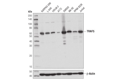TRAF5 regulates signaling through binding to the cytoplasmic domains of TNFR family members including CD40, CD27, CD30, OX40, and lymphotoxin-β receptor (5-10). Overexpression of TRAF5 induces NF-κB activation. Cytoplasmic aggregates of TRAF5, as well as TRAF2, were reported in Hodgkin-Reed-Sternberg cells, resulting in constitutive NF-κB activation (11).
