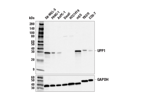 UPP1 Antibody recognizes endogenous levels of total UPP1 protein. This antibody may also detect a non-specific band at approximately 45 kDa in a limited number of cell lines.