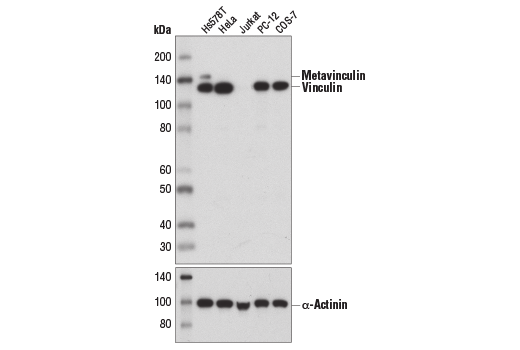 Vinculin (E1E9V) Rabbit Monoclonal Antibody (BSA and Azide Free) recognizes endogenous levels of total vinculin protein. This antibody also reacts with metavinculin, a 145 kDa splice variant of vinculin.
