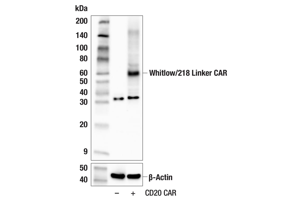 Whitlow/218 Linker (F2G3S) Rabbit Monoclonal Antibody (BSA and Azide Free) recognizes exogenously expressed levels of scFv-based CARs containing a Whitlow/218 linker. This antibody cross-reacts with a protein of unknown identity at approximately 35 kDa in Jurkat cell extracts.
