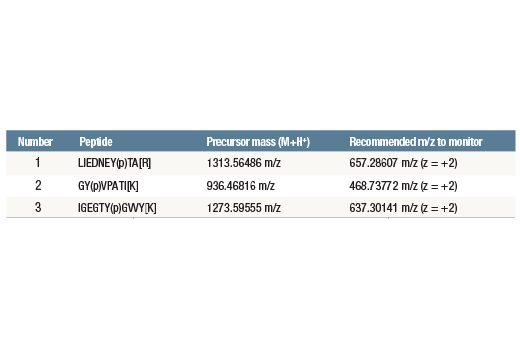 Use with Cell Signaling Technology’s PTMScan® kit protocol from the Immunoaffinity Purification (IAP) step. Because the optimal amount of PTMScan® Control Peptides Phospho-Tyrosine for each user’s experiments will depend on unique factors, such as mass spectrometer sensitivity, users may dilute these control peptides as needed.