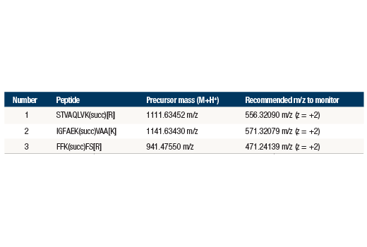 Use with Cell Signaling Technology’s PTMScan® kit protocol from the Immunoaffinity Purification (IAP) step. Because the optimal amount of PTMScan® Control Peptides Succinyl-Lysine for each user’s experiments will depend on unique factors, such as mass spectrometer sensitivity, users may dilute these control peptides as needed.