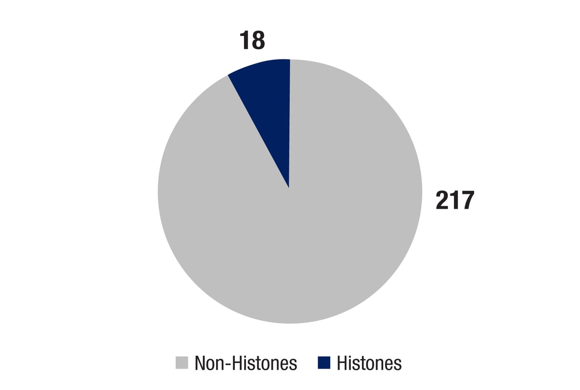 Most PKMT substrates are histone proteins and transcription factors, emphasizing the importance of lysine methylation in regulating chromatin structure and gene expression. Lys9 of histone H3 is mono- or di-methylated by G9A/GLP and tri-methylated by SETDB1 to activate transcription. JHDM3A-mediated demethylation of the same residue creates mono-methyl Lys9 and inhibits gene transcription (5). Tumor suppressor p53 is regulated by methylation of at least four sites. p53-mediated transcription is repressed following mono-methylation of p53 at Lys370 by SMYD2; di-methylation at the same residue further inhibits p53 by preventing association with 53BP1. Concomitant di-methylation at Lys382 inhibits p53 ubiquitination following DNA damage. Mono-methylation at Lys382 by SET8 suppresses p53 transcriptional activity, while SET7/9 mono-methylation at Lys372 inhibits SMYD2 methylation at Lys370 and stabilizes the p53 protein. Di-methylation at Lys373 by G9A/GLP inhibits p53-mediated apoptosis and correlates with tri-methylation of histone H3 Lys9 at the p21 promoter (1,6). Overexpression of PKMTs is associated with multiple forms of human cancer, which has generated tremendous interest in targeting protein lysine methyltransferases in drug discovery research.