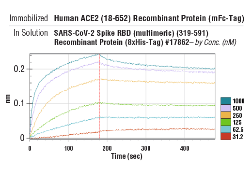 Human ACE2 (18-652) Recombinant Protein (mFc-Tag) is derived from a recombinant expression construct corresponding to the extracellular domain of human ACE2 protein, including the sequence regions that function as receptors for SARS and SARS-CoV-2 coronaviruses. The expressed protein contains a murine Fc-Tag at its carboxy terminus.