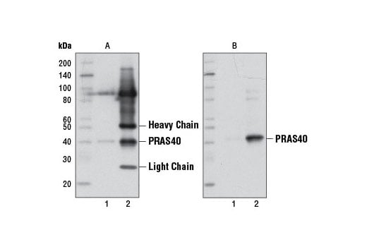 Mouse Anti-Rabbit IgG (Conformation Specific) (L27A9) mAb only reacts with native IgG and does not bind to the denatured and reduced rabbit IgG heavy chain or light chain. When performing immunopreciptiation (IP) followed by western blotting, the denatured rabbit IgG light and heavy chains of the primary antibody used for IP run at approximately 25 and 50 kD, respectively, on the subsequent western blot and can often obscure bands of proteins that have similar molecular weights. Using Mouse Anti-Rabbit IgG (Conformation Specific) (L27A9) mAb as a secondary antibody will eliminate this problem.