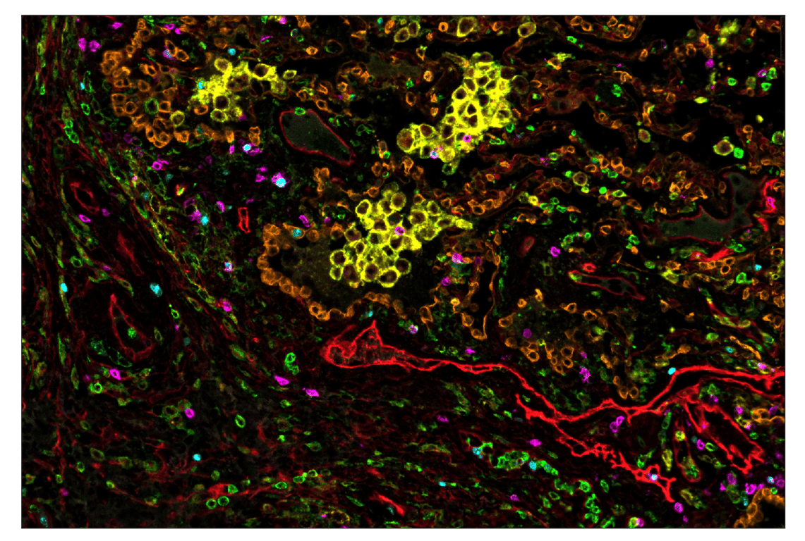 SignalStar Oligo-Antibody Pairs are compatible with the SignalStar Multiplex IHC Buffer Kits for use in fluorescent multiplex imaging experiments. This product includes the oligo-conjugated antibodies and complementary oligos required for labeling your target protein on up to 10 slides. SignalStar Multiplex IHC Buffer Kits are required to amplify and image the target signal. Multiple oligo-antibody pairs can be conveniently combined into a multiplex panel using the SignalStar Multiplex IHC Panel Builder. SignalStar Multiplex IHC Kits & Reagents are not compatible with all of Cell Signaling Technology® products and protocols that are recommended for use in immunohistochemical assays.