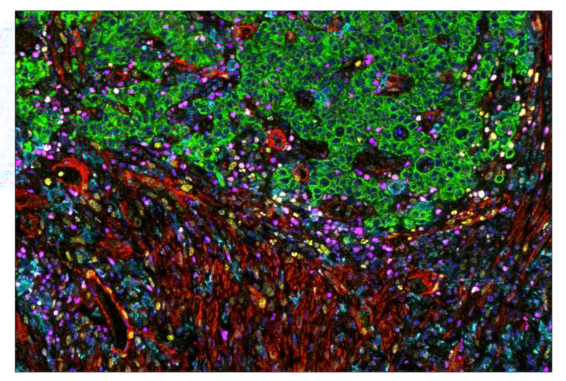 SignalStar Oligo-Antibody Pairs are compatible with the SignalStar Multiplex IHC Buffer Kits for use in fluorescent multiplex imaging experiments. This product includes the oligo-conjugated antibodies and complementary oligos required for labeling your target protein on up to 10 slides. SignalStar Multiplex IHC Buffer Kits are required to amplify and image the target signal. Multiple oligo-antibody pairs can be conveniently combined into a multiplex panel using the SignalStar Multiplex IHC Panel Builder. SignalStar Multiplex IHC Kits & Reagents are not compatible with all of Cell Signaling Technology® products and protocols that are recommended for use in immunohistochemical assays.