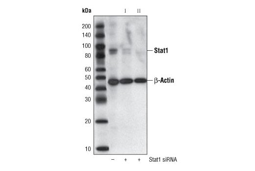 SignalSilence® Stat1 siRNA allows the researcher to specifically inhibit Stat1 expression by RNA interference, a method in which gene expression can be selectively silenced through the delivery of double stranded RNA molecules into the cell. All SignalSilence® siRNA products from CST are rigorously tested in-house and have been shown to reduce protein expression in specified cell lines.